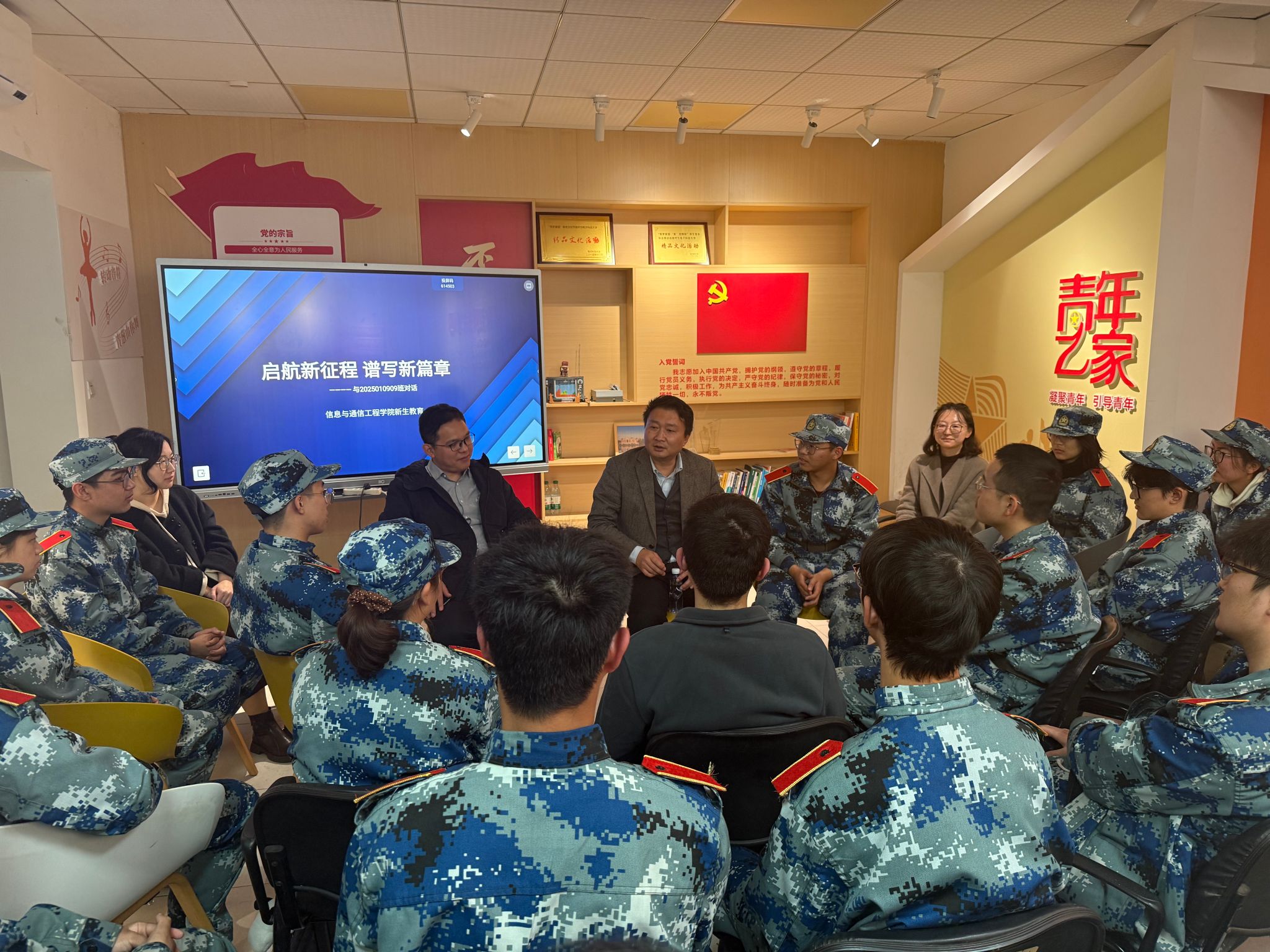 黄钰林院长与耿宝莹副书记在“一站式”学生社区同学院2025010909班新生进行了座谈交流,就同学们初入大学遇到的困惑、专业认知、未来规划等话题展开了轻松而深入的讨论,现场气氛热烈。