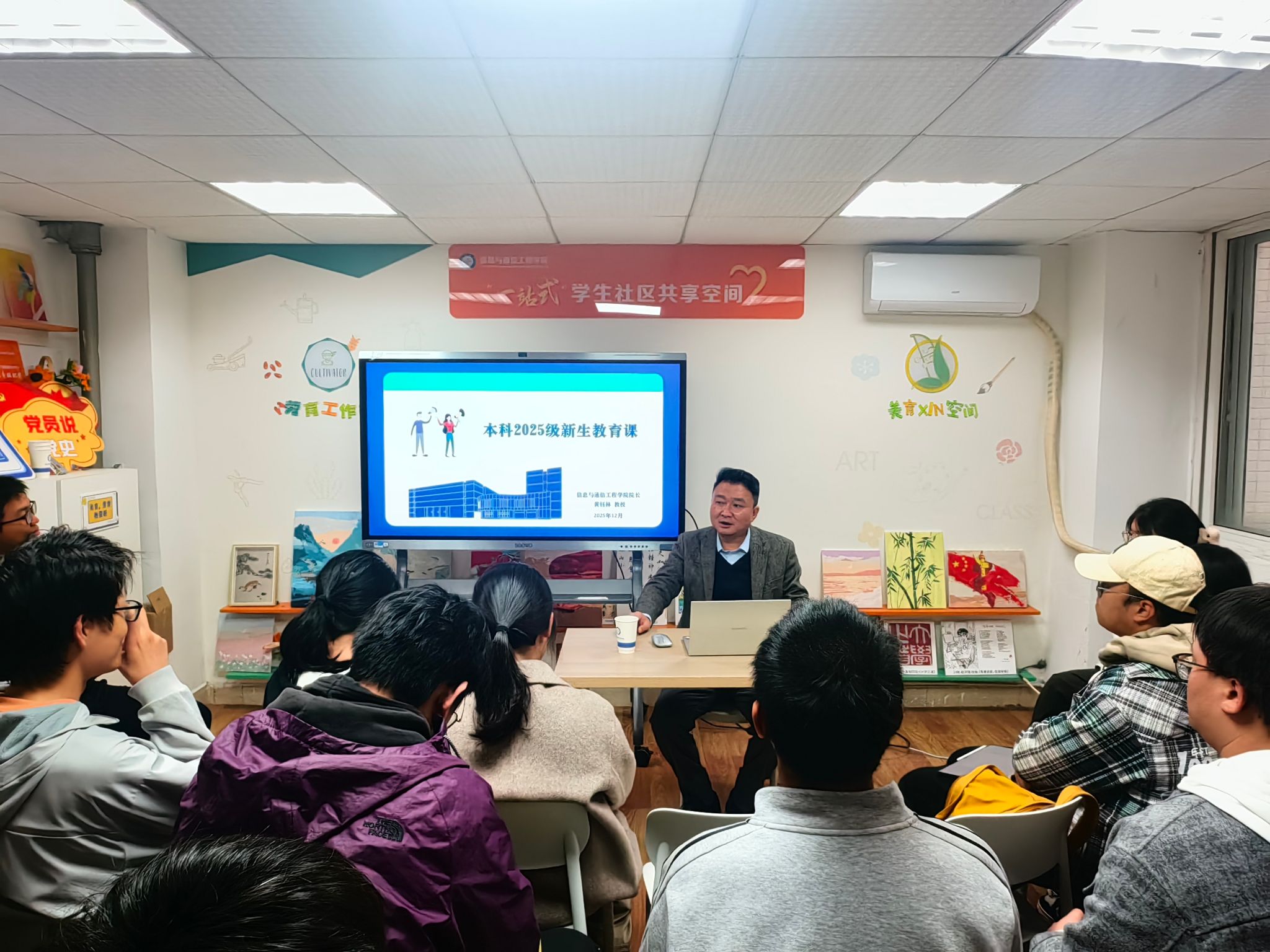 12月1日,黄钰林院长走进学院“一站式”学生社区——“家门口的青年学堂”,面向学院科技与艺术联合学位实验班全体学生,讲授了一堂内容丰富的新生教育课。课程围绕大学学习方法的转变、专业融合趋势、创新思维培养等关键议题展开。黄钰林院长结合学科前沿动态与人才培养要求,鼓励同学们立足学校学院提供的平台资源,夯实专业基础,注重综合发展,树立远大的人生目标。他还与同学们就专业学习、校园生活等方面进行了广泛交流,耐心解答了同学们的疑问。