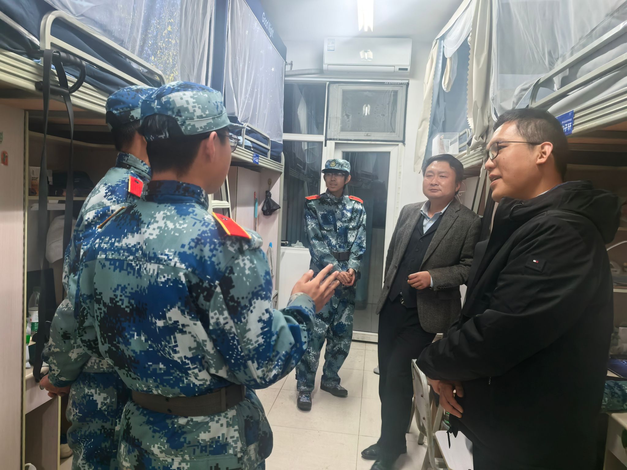 11月25日,黄钰林院长与耿宝莹副书记共同走访学生寝室,看望正在经历军训锤炼的2025级本科新生。两位老师与同学们深入交谈,细致关心大家的训练感受与生活适应情况,鼓励同学们在军训中磨炼意志,培养集体精神,为大学生活打下坚实基础。