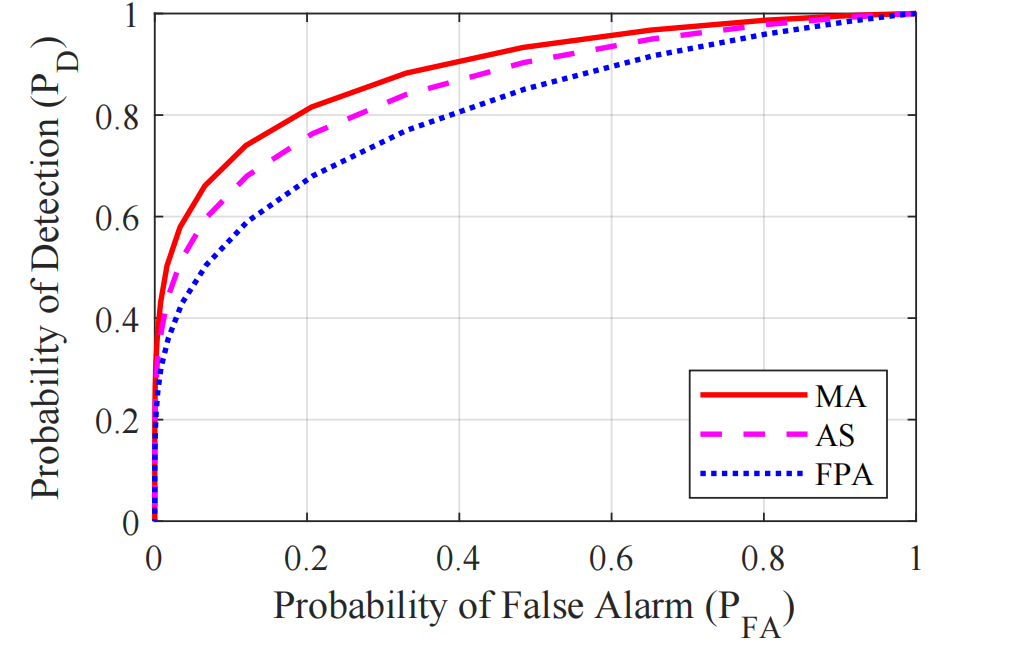 在仿真验证环节,研究团队重点考察了系统在严格阈值约束下的检测性能。结合仿真得出的对比曲线可以看出,在极低虚警概率(如0.001)的条件下,基于MA的频谱感知系统能够更有效地捕获空间分集增益。其主用户检测概率和整体鲁棒性均优于传统的天线选择(AS)系统与固定位置天线(FPA)系统,为未来认知无线电网络中感知能力的跨越式提升提供了理论支撑与设计参考。