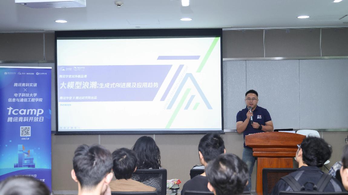 随后的分享交流环节,由腾讯学堂讲师同时也是电子科技大学2000级校友黄斌老师为同学们带来了一场关于AI技术应用的深度讲座。分享聚焦于驱动AI发展的三大核心要素——算力、数据与人才,进行了系统性的剖析。讲师进一步介绍了AI如何向企业端(ToB)与消费端(ToC)进行赋能,并阐述了大模型技术对游戏、广告、医疗等多个行业的颠覆性重构与创新机遇,为同学们勾勒出一幅清晰的AI产业应用图谱。