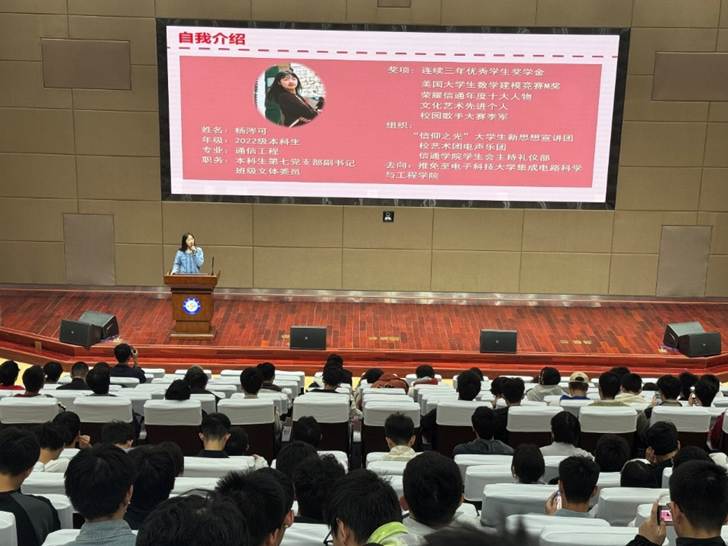 杨涔可围绕“让热爱发光,让青春发烫”分享感悟,呼吁大家摆脱“唯分数论”的束缚。她建议学习中既要研读书本,也要重视 PPT 学习,减少考前突击,认真对待每一门课程。在选择上,她提醒同学们不要人云亦云,尽早明确保研、考研、留学、就业等未来方向,在学习中找到专属节奏。此外,她鼓励大家积极参与艺术团、宣讲团等组织,让热爱为青春添彩。