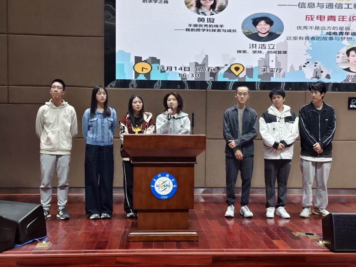 11月14日,学校大型青年互动演说分享节目 “成电青年说” 第59期在图书馆求实厅开讲。本次活动以“榜样引领,研途可期”为主题,邀请2022级优秀学长学姐张晰元、黄璇、洪浩立、沈浩然、蓝紫姗、杨涔可、张梓轩七位同学,围绕求学探索、跨学科成长、时间管理、全面发展等多个维度,分享他们的大学经历与青春感悟,为学弟学妹们点亮成长之路。