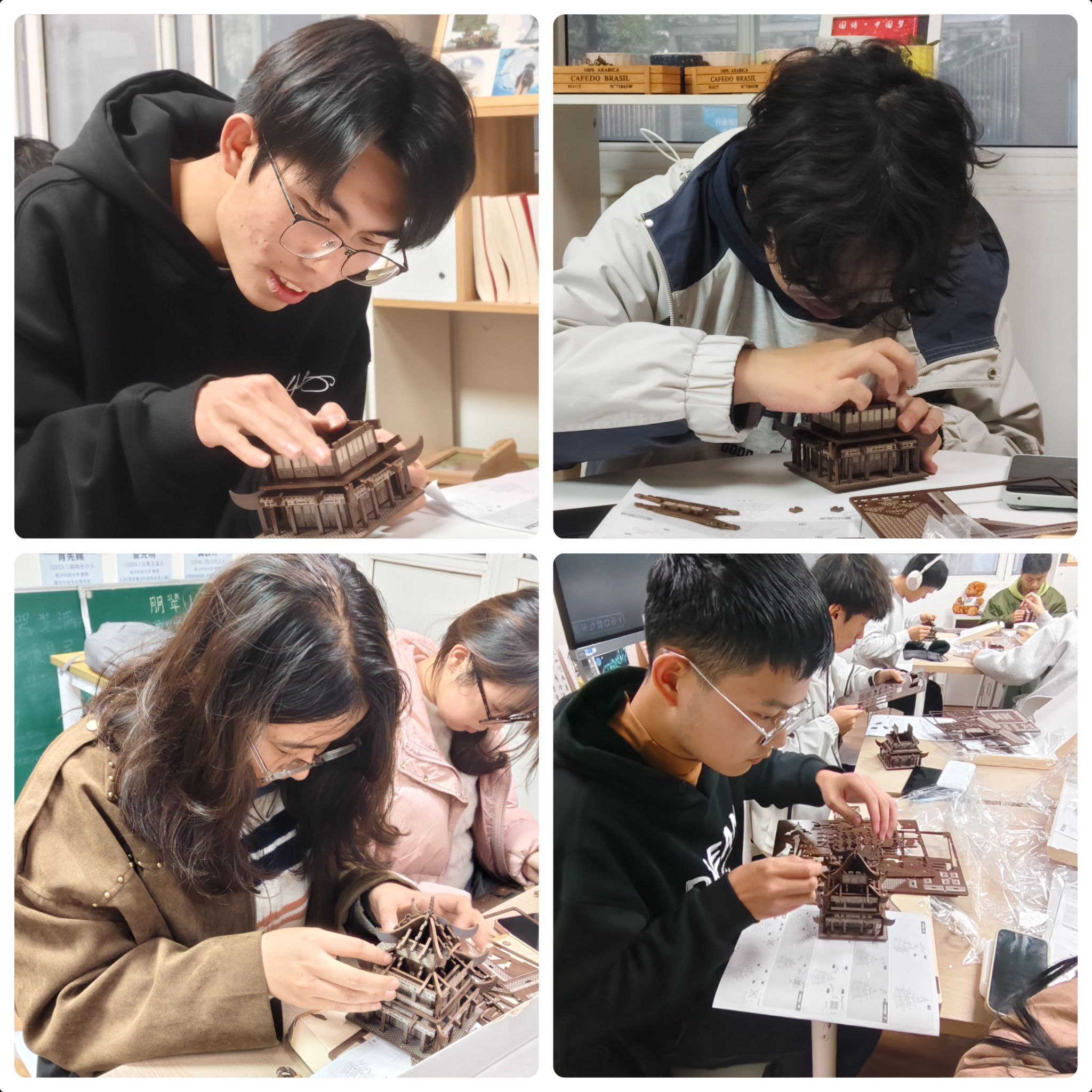 无需一钉一铆,仅靠构件间的凹凸咬合便能稳固成型,榫卯结构所蕴含的“天人合一”“虚实相生”的东方哲学,让同学们在亲手搭建中获得了直观且深刻的体验。大家纷纷表示,这场活动不仅锻炼了动手能力,更让自己读懂了古典建筑背后的文化密码,对传统文化的热爱愈发浓厚。活动尾声,同学们手持自己完成的建筑模型合影留念,定格下收获满满的美好瞬间。