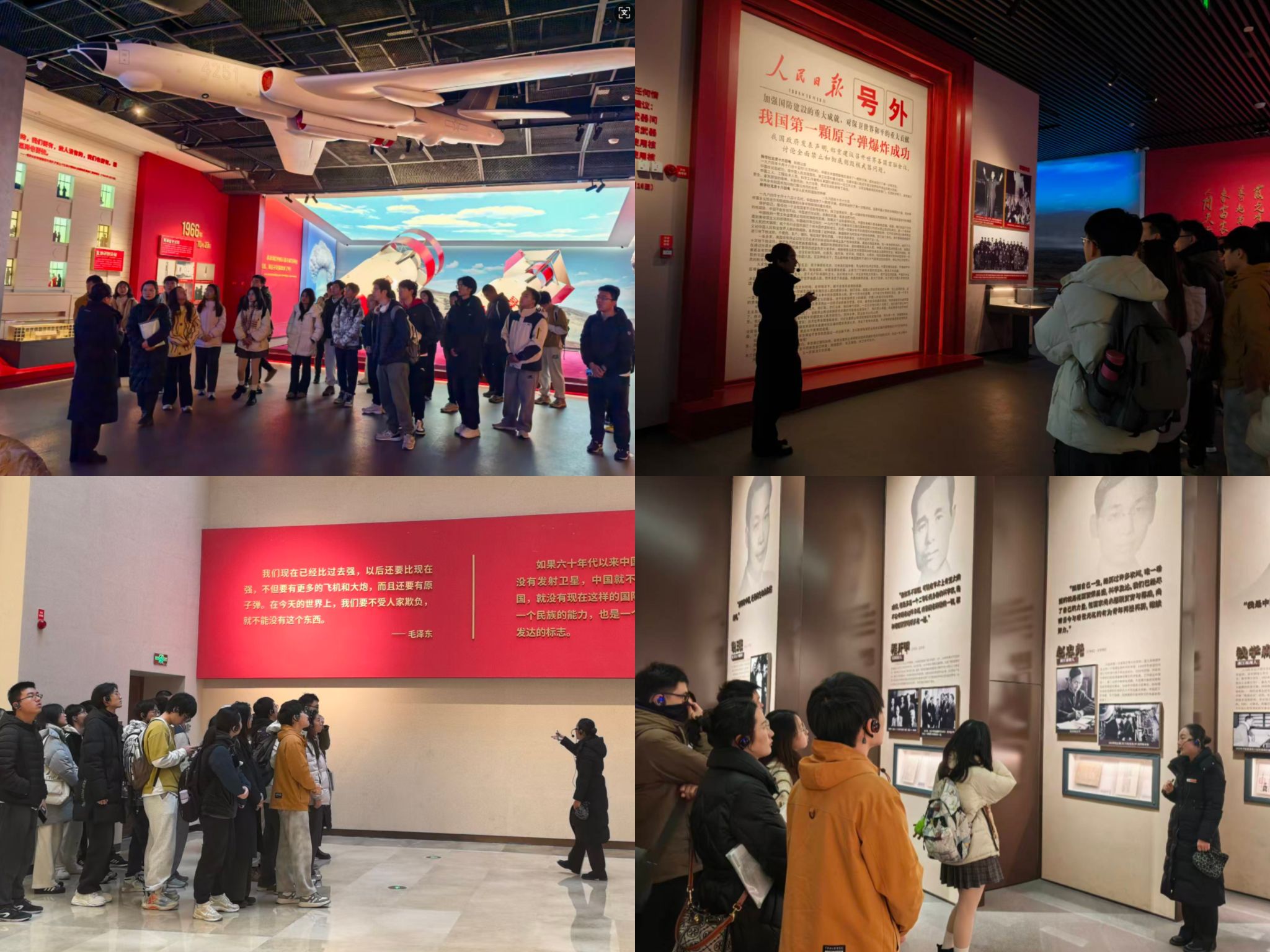 讲解员以我国“两弹一星”的建设历程为主线,为同学们系统讲解了这段波澜壮阔的历史。从二战末期美国向日本投放原子弹,到朝鲜战争期间美国多次发出核威胁,帝国主义的核讹诈阴影笼罩着新中国。1955年,党中央作出了发展原子能的战略决策,开启了我国独立自主研制核武器的艰难征程。随即,朱光亚、邓稼先等大批科学家冲破国外重重阻力毅然回国,投身 “两弹一星” 事业,成为这一伟大事业的奠基者与开拓者。面对物资、经验匮乏及苏联专家撤走等困难,中国自力更生,于1964年10月16日成功爆炸第一颗原子弹,实现独立自主研发。1967年6月17日,第一颗氢弹爆炸试验成功。展览结束后,同学们感慨纷纷,深受热爱祖国、无私奉献,自力更生、艰苦奋斗,大力协同、勇于登攀的 “两弹一星” 精神鼓舞。