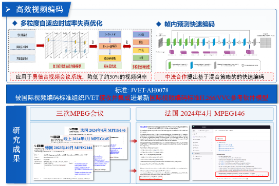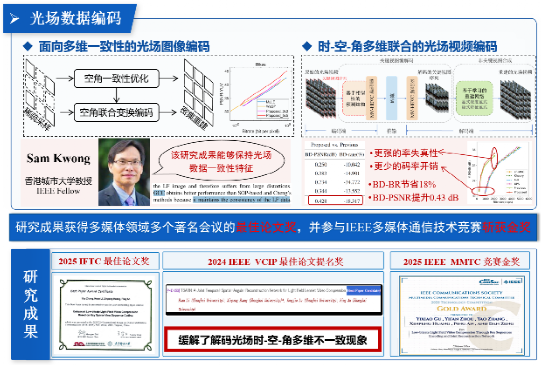 为了提高数据质量,进一步开展了光场复原、显著性检测和光场拼接等预处理研究,从而为后续的压缩编码和重建提供清晰且结构一致的光场数据基础。在数据质量保证的前提下,项目组围绕光场数据的高效压缩开展了深入研究(图3)。在视频编码方面,提出了多粒度自适应的时域率失真优化技术;并与法国国家科学研究中心合作团队联合提出帧内预测的快速编码算法,有效提升了编码效率。相关技术被国际视频编码标准组织 JVET 接纳并集成至最新视频编码标准 H.266/VVC 参考软件中。进一步地,考虑到光场图像在空间和角度维度上具有天然相关性,传统编码往往会破坏这种一致性,导致重建质量下降。为此,提出了面向多维一致性的光场编码方法,通过优化空间–角度一致性并采用联合变换编码,使低码率与视觉一致性得以兼顾。在光场视频场景中,又引入时间维度,构建了“时–空–角”联合编码框架,采用关键视图序列编码与非关键视图合成策略,大幅减少码率开销,同时保持高质量视觉效果。相关研究成果不仅获得多媒体领域国际会议的最佳论文奖或提名奖,还在国际竞赛中获得金奖。