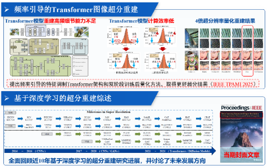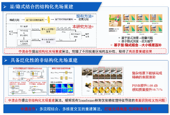 2、项目组围绕光场高质量重建问题合作开展了相关研究(图4)。针对现有Transformer模型在高频细节重建能力不足、计算复杂度高的问题,提出频率引导的特征调制Transformer超分辨率重建框架和双阶段训练后量化方法,在保证重建质量的同时提升计算效率;同时,系统梳理了近十年基于深度学习的超分辨率重建发展脉络,该成果被选为领域著名期刊Proceedings of The IEEE(影响因子:25.9)的当期封面文章,体现了本项目研究成果在高质量重建领域的学术影响力。进一步地,项目组成员上海大学与澳大利亚悉尼科技大学合作团队合作提出显式与隐式相结合的结构化光场重建方法,有效缓解显式方法易产生混叠、隐式方法易丢失细节的问题,在大视差与小视差区域均取得了更高质量的光场重建效果;面向复杂真实场景,提出具备良好泛化能力的非结构化光场重建方法,通过引入几何感知的Transformer与隐式辐射场解码机制,联合建模空间、角度与几何信息,实现高精度表面渲染与视角合成。