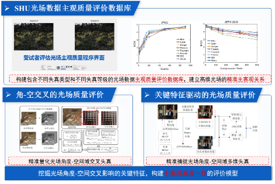 3、项目组围绕光场多维评价问题开展了系统研究(图5)。首先,构建了SHU光场主观质量评价数据库,涵盖多种光场场景、多类失真类型以及不同的失真强度等级,同时设计了完整规范的主观测试流程,获得了大量可靠的人眼主观评分数据,为后续模型研究提供了权威的数据基础。在此基础上,提出了角度–空间交叉的光场质量评价方法,通过分析聚焦栈和宏像素等特有结构,能够更加准确地刻画角度与空间维度之间的失真交互。进一步地,为更好贴近人眼感知机制,提出了关键特征驱动的光场质量评价模型,从影响视觉感知的关键结构与视角变化中提取判别特征,从而实现对多维失真的有效建模。实验结果显示,该方法在多种失真条件下的预测结果与人眼主观评价高度一致,弥合了光场数据在角度与空间维度上的主客观感知差异。