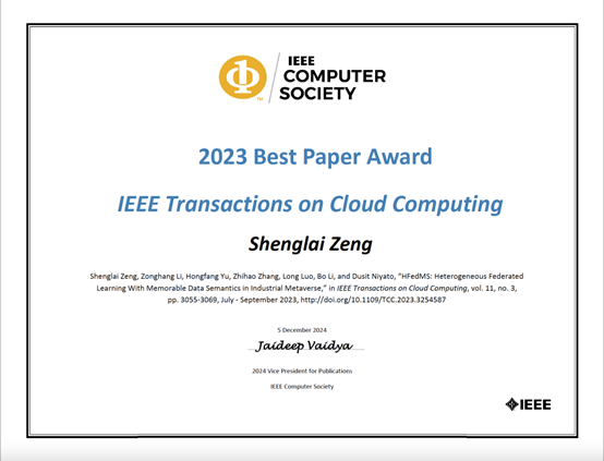 Recently, the Smart Networks and Applications team from the School of Information and Communication Engineering won the only 2023 Best Paper Award of IEEE Transactions on Cloud Computing. Their award-winning paper is titled "HFedMS: Heterogeneous Federated Learning with Memorable Data Semantics in Industrial Metaverse."